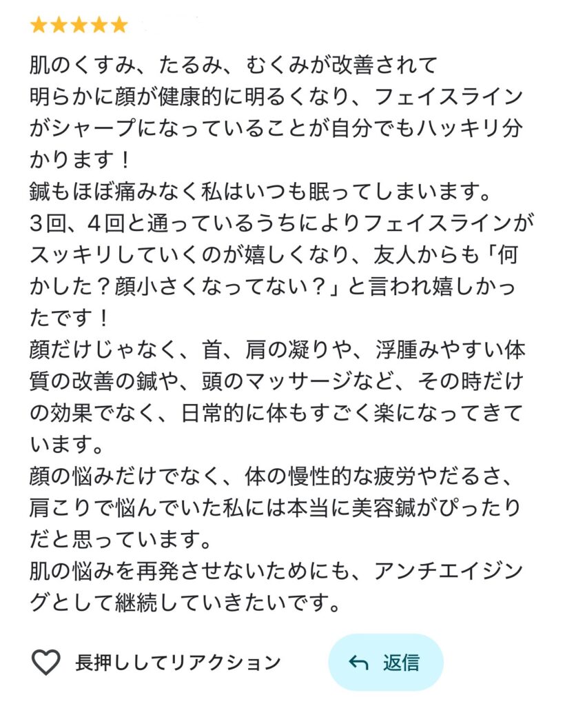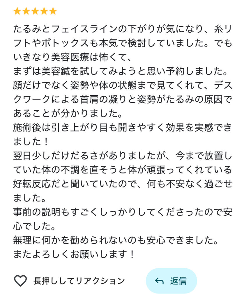 顔だけでなく、首・肩・姿勢・噛み締めなど、”悩みの原因”をまとめて調整するため結果が出やすく持ちも良いです
