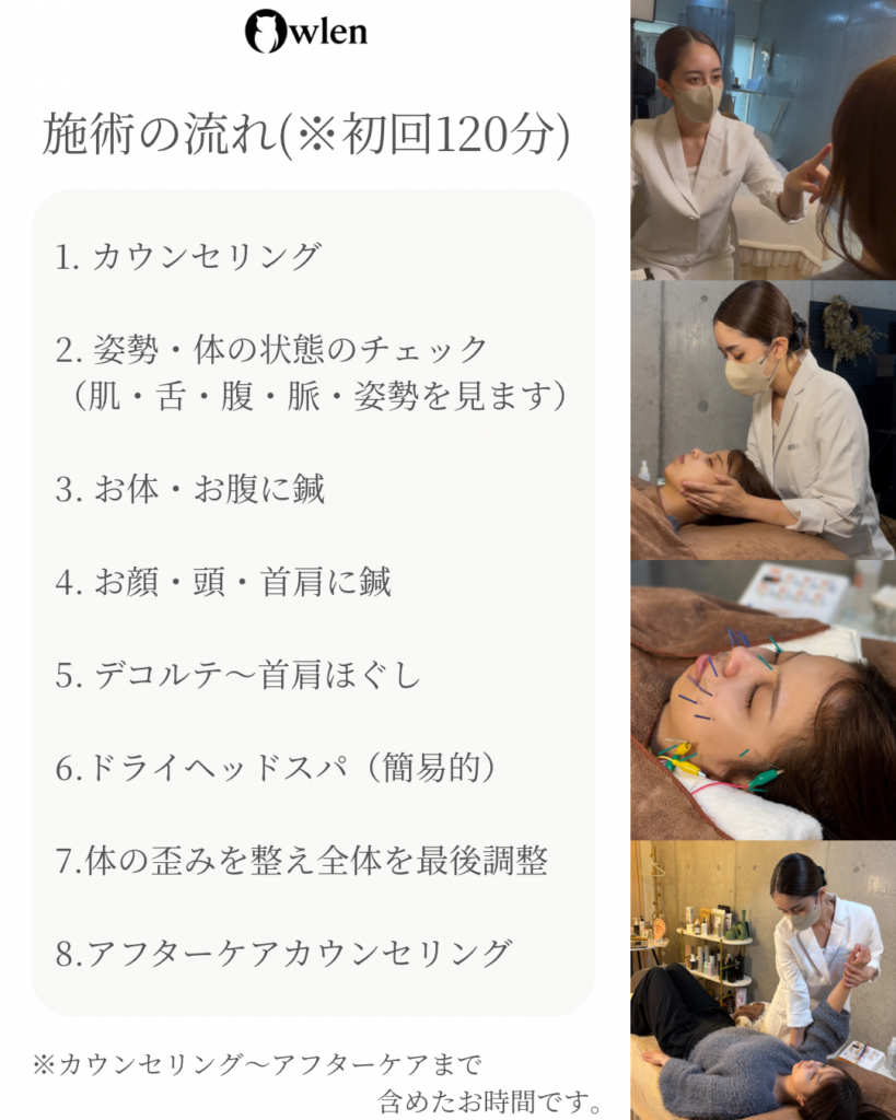 お顔だけでなく体全体の状態を確認し、姿勢・血流・自律神経まで整えながら行います。